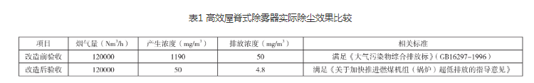 根據電廠除塵改造前后的環境影響評價報告,實際顆粒物排放數據見表1。根據表1的驗收結果,生物質鍋爐的顆粒物排放濃度為添加高效屋頂除霧器后達到4.8mg/m3,符合“關于加快燃煤機組(鍋爐)超低排放的指導意見”。標準除塵要求小于5mg/m3是好的。